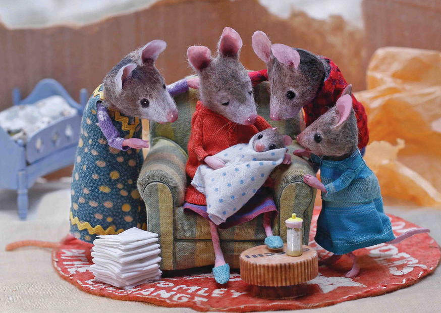 In einem gemütlichen Wohnzimmer umringt eine Gruppe von Mäusen eine Muttermaus, die stolz ihr Neugeborenes in den Armen hält. Die Szene strahlt Wärme und Familie aus.