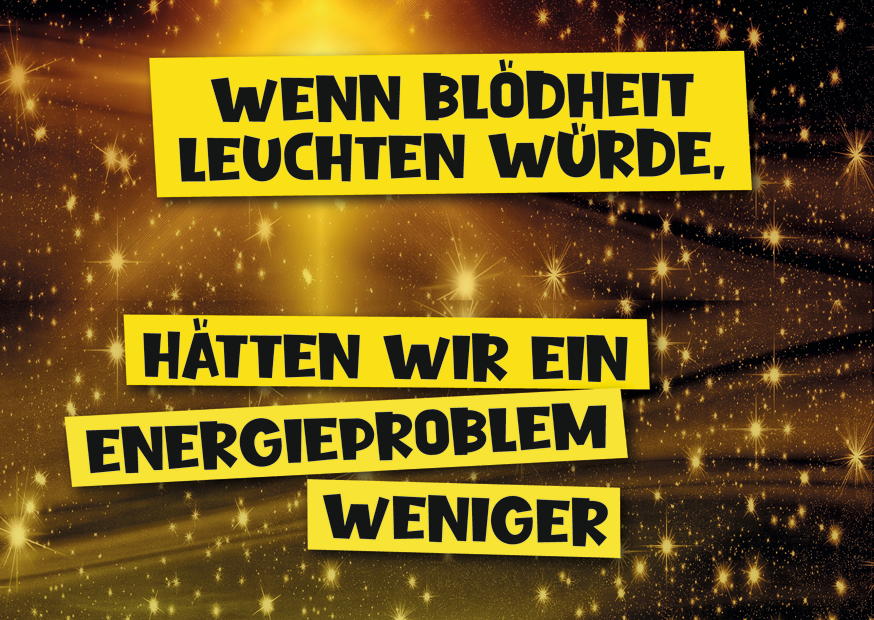 Der Spruch, in gelber Schrift vor einem glitzernden Hintergrund, spielt humorvoll mit der Vorstellung von Blödheit und Energie. Er regt zum Nachdenken an.