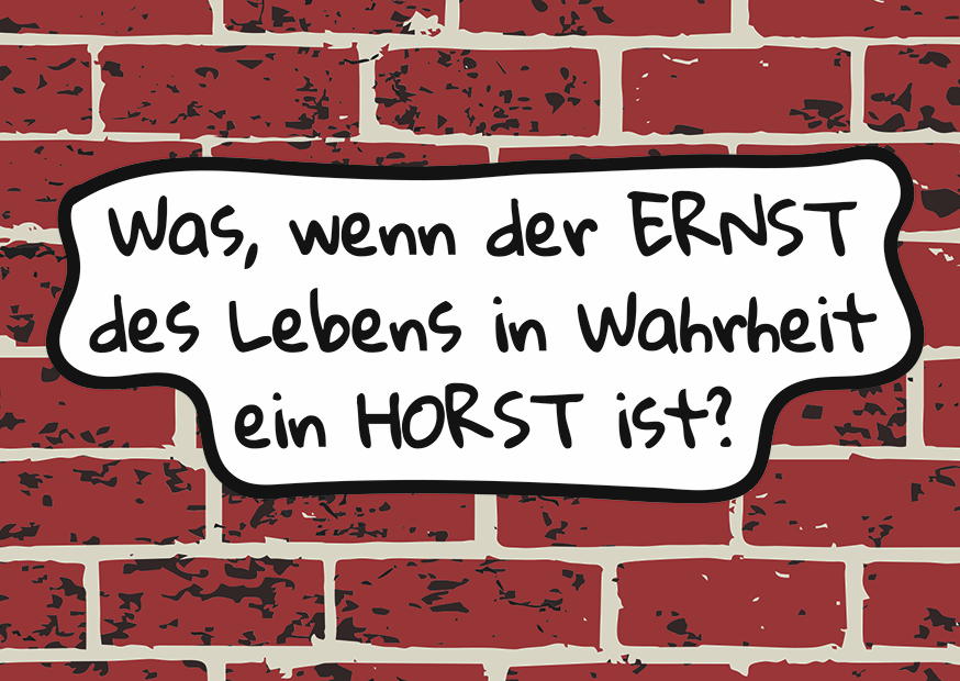 Eine nachdenkliche Aussage reflektiert über den Ernst des Lebens und stellt humorvoll die Frage, ob dies vielleicht ein Horst ist. Die Wand ist rot und besteht aus Ziegeln.