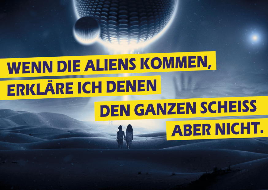 Zwei Figuren stehen in einer surrealen Landschaft und blicken auf einen faszinierenden Nachthimmel mit Planeten und Sternen. Eine humorvolle Botschaft über Außerirdische ist hervorgehoben.