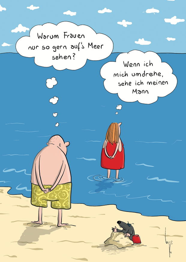 Am Strand stehen ein Mann und eine Frau am Wasser. Die Frau blickt nachdenklich auf das Meer, während der Mann sich fragt, warum Frauen es so sehr mögen. Ein Hund liegt im Sand.