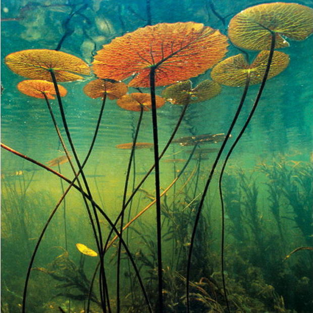 Unter Wasser sind farbenfrohe Blätter von Seerosen zu sehen, die sanft im klaren Wasser swingen. Lichtstrahlen brechen durch die Wasseroberfläche und erzeugen ein faszinierendes Muster.
