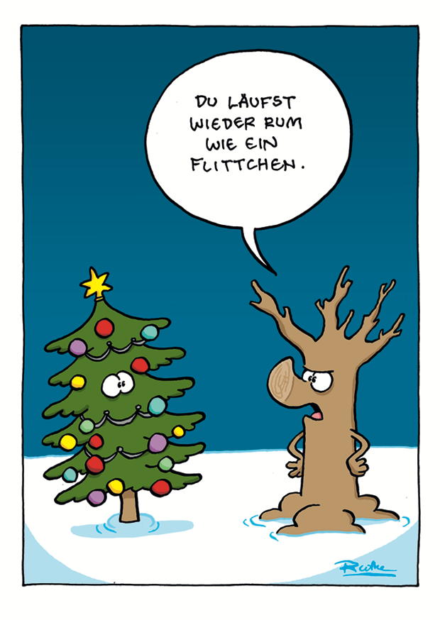 In winterlicher Umgebung stehen ein geschmückter Tannenbaum und ein verärgerter Baum im Schnee. Der Tannenbaum erfreut sich, während der andere ihn anmeckert.