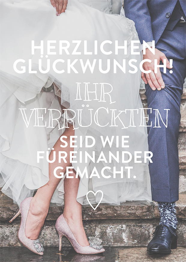 Zwei Personen mit elegantem Hochzeitskleid und Anzug sitzen auf einer Treppe. Die Karte wünscht dem Paar viel Glück und betont ihre perfekte Verbindung.