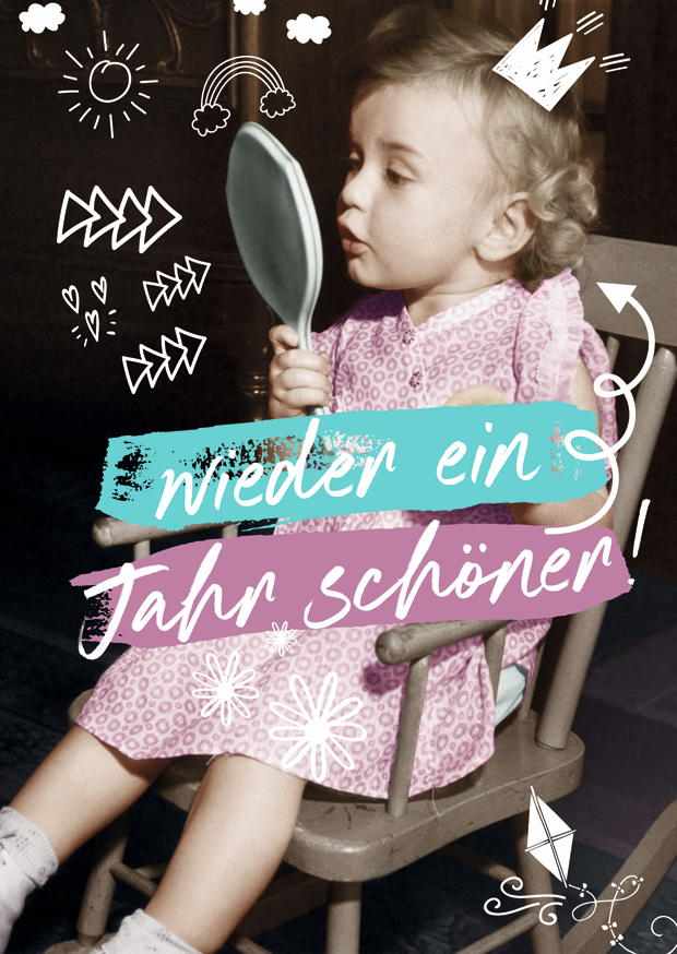Ein fröhliches kleines Mädchen mit lockigen Haaren sitzt in einem Kinderstuhl und schaut neugierig in einen Spiegel, umringt von einer festlichen Atmosphäre.