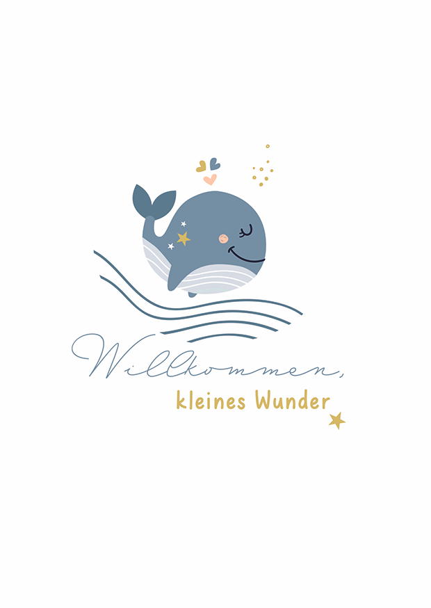 Ein verspieltes Wal-Motiv in sanften Farben präsentiert eine herzliche Botschaft zur Begrüßung eines Neugeborenen. Ideal für Babypartys oder Kinderzimmerdekoration.
