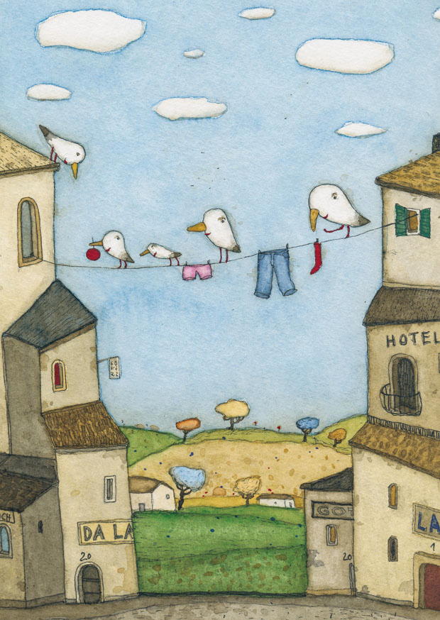 Zwei Möwen sind auf einer Wäscheleine zwischen Häusern in einer malerischen Stadt. Die Umgebung ist ruhig und zeigt sanfte Hügel unter einem klaren Himmel.