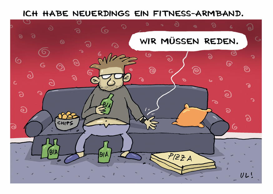 Ein Mann liegt entspannt auf dem Sofa, umgeben von Snacks und Bierflaschen, während er sein neues Fitness-Armband präsentiert und humorvoll diskutiert.