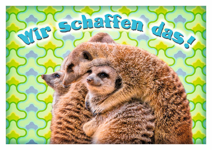 Eine Gruppe von Erdmännchen zeigt Zuneigung, während sie sich umarmen und eine positive Botschaft ausstrahlen. Die bunten Farben im Hintergrund verleihen dem Moment Lebensfreude.