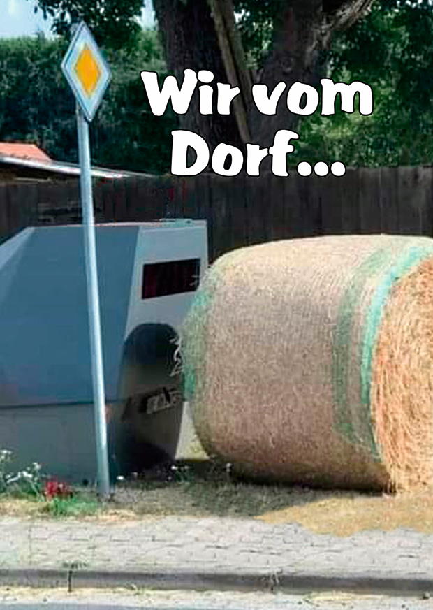 Ein großer Heuballen liegt neben einem modernen Müllbehälter an einer ländlichen Straße. Die Szenerie zeigt typisch dörfliche Atmosphäre mit Blumen und einem blauen Himmel.
