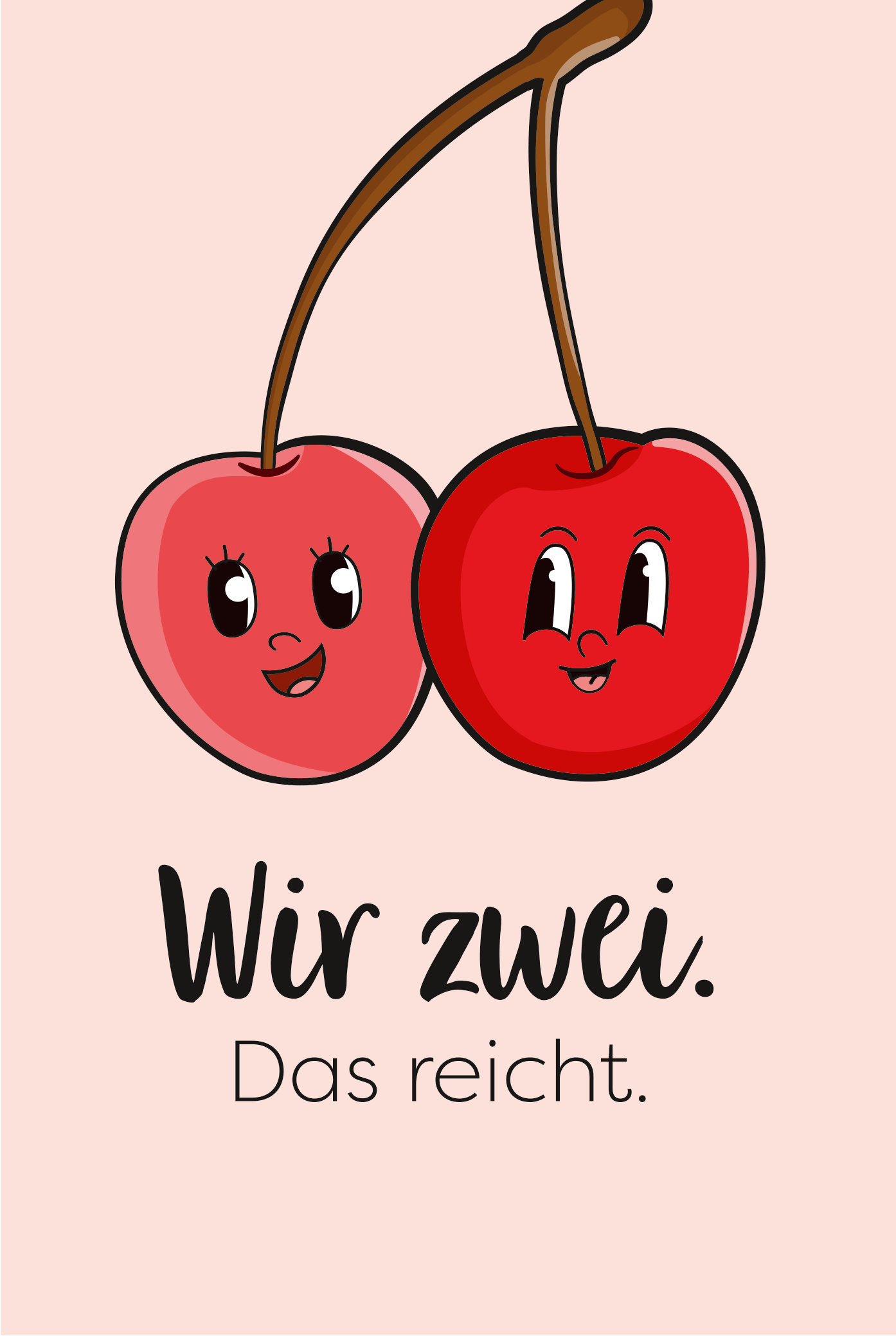 Zwei Kirschen, eine rot und eine rosa, lächeln auf einem sanften Hintergrund. Der Schriftzug beschreibt ihre enge Verbindung und eignet sich gut für festliche Anlässe.