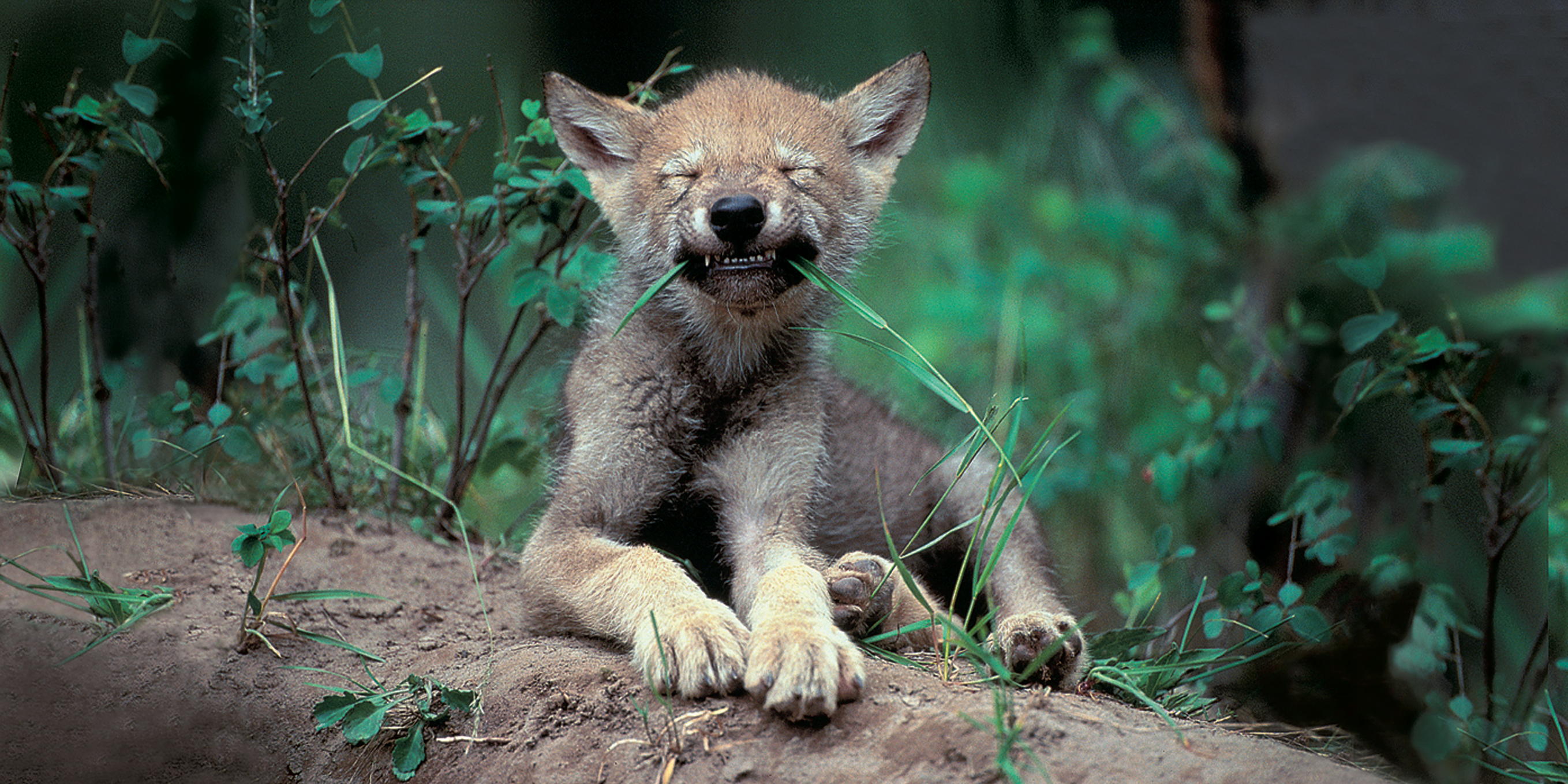 Der junge Wolf lächelt und knabbert an einem Grashalm, während er im weichen Erdreich sitzt. Um ihn herum wachsen grüne Pflanzen, die die Szenerie lebendiger machen.
