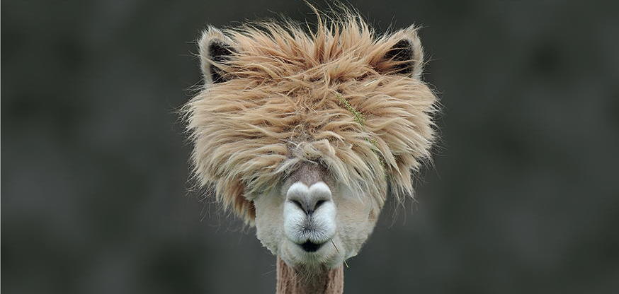 Das Lama steht vor einem unscharfen Hintergrund und zeigt sein einzigartiges, strubbeliges Fell. Es wirkt freundlich und neugierig, während es in die Kamera schaut.