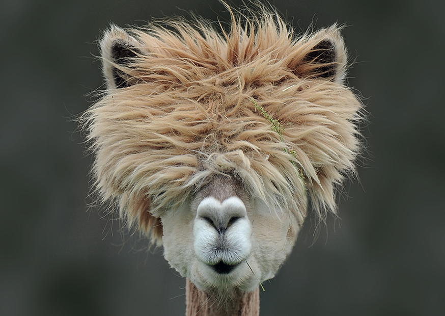 Das Lama steht entspannt in einer natürlichen Umgebung und zeigt sein auffälliges, lockiges Fell. Es scheint freundlich und interessiert.