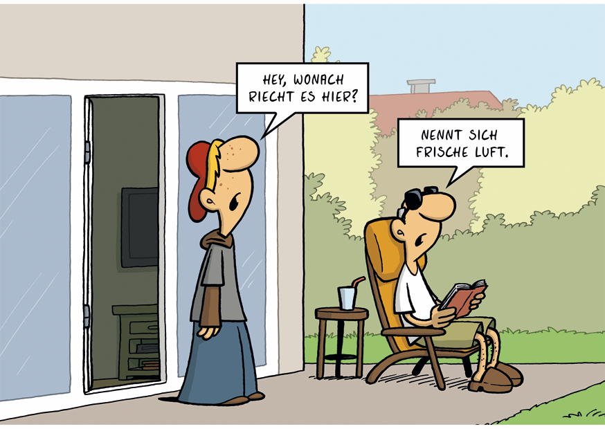 Zwei Männer stehen im Garten, einer sitzt auf einer Liege und liest. Der andere fragt nach dem Duft, während sie die Sonne und frische Luft genießen.