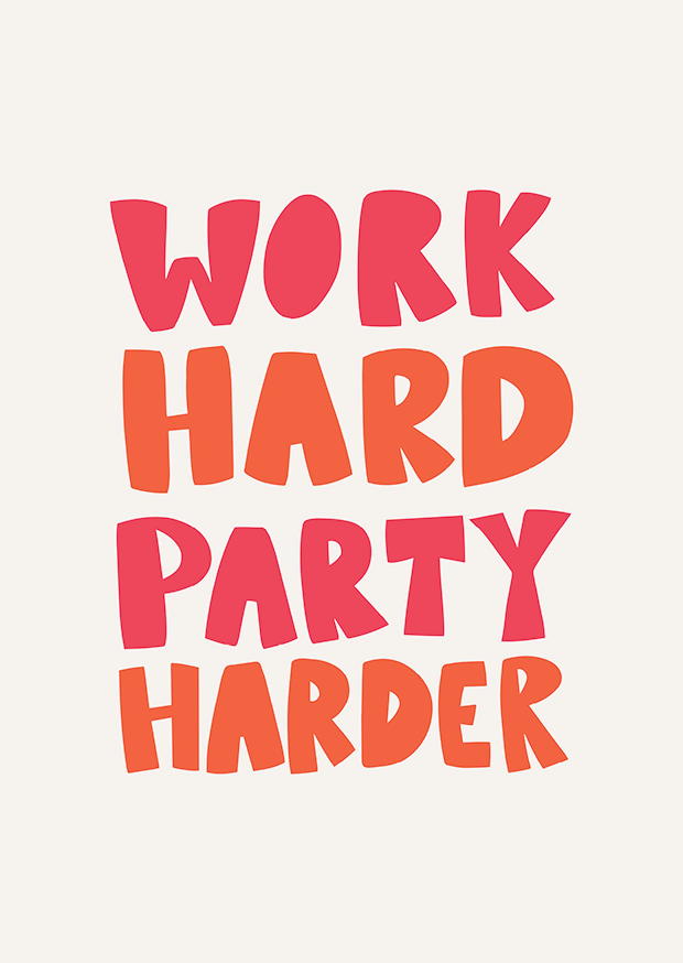 Ein inspirierender Spruch ermutigt dazu, hart zu arbeiten und noch härter zu feiern. Die bunten Buchstaben setzen einen positiven Akzent in jedem Raum.