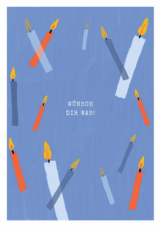Auf einem blauen Hintergrund leuchten bunte Kerzen in verschiedenen Farben. Darauf steht der fröhliche Text Wunsch dir was, der positive Stimmung verbreitet.