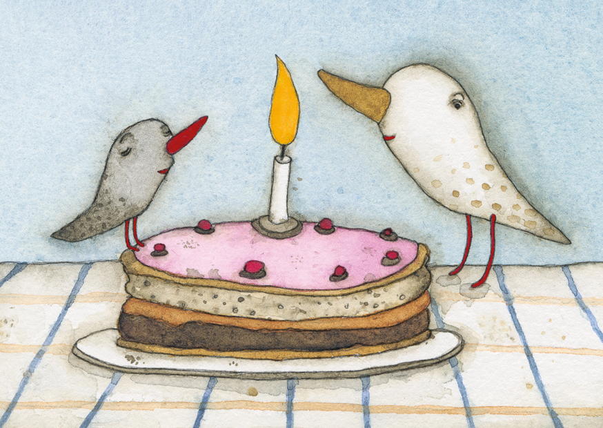 Zwei verspielte Vögel stehen neben einer festlichen Torte mit einer Kerze darauf, während sie einen Geburtstag in einer freundlichen Atmosphäre zelebrieren.