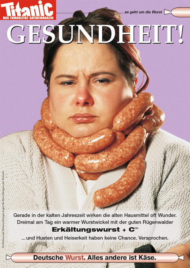 Die Frau trägt eine Kette aus Würsten und präsentiert auf witzige Weise, wie wichtig gute Ernährung während der kalten Monate ist.