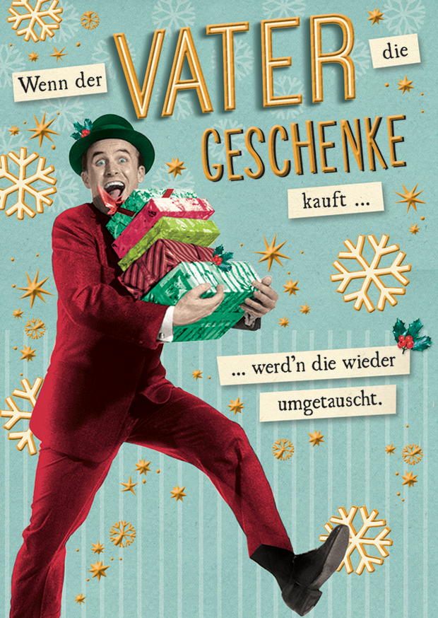 Ein fröhlicher Vater in einem roten Anzug hält mehrere Geschenkboxen in den Händen. Er lächelt enthusiastisch, während er in einer festlich dekorierten Umgebung steht.