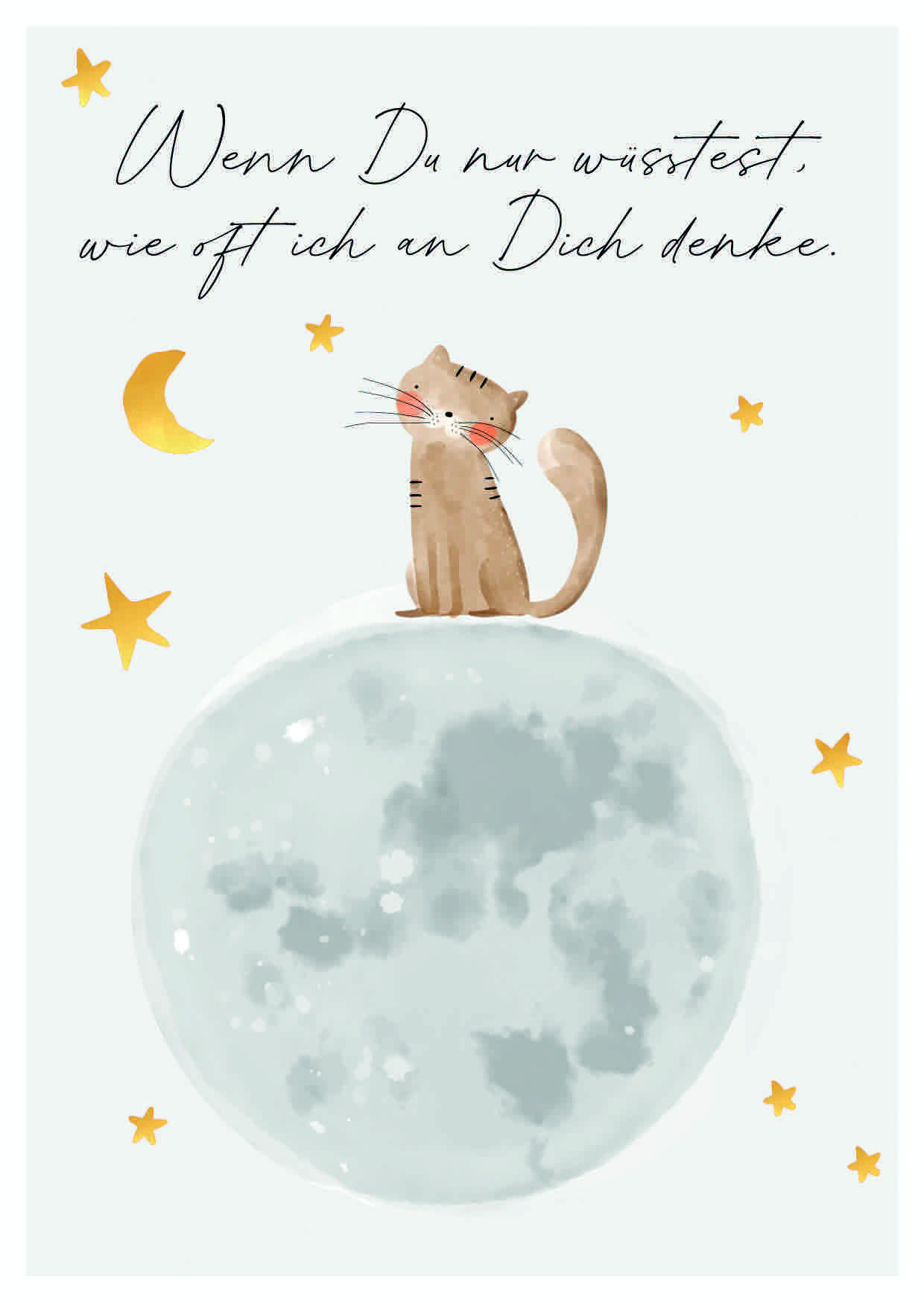Eine niedliche Katze sitzt auf dem Mond und schaut nachdenklich in die Ferne. Umgeben von schimmernden Sternen und einem Halbmond in einer klaren Nacht.