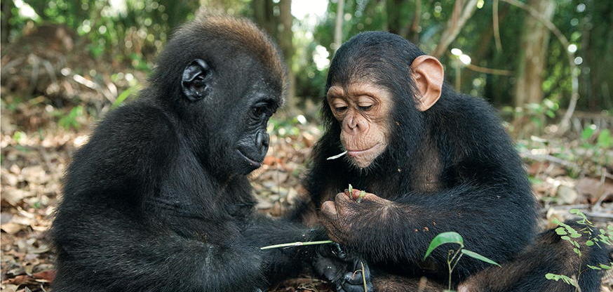 Zwei junge Affen, ein Gorilla und ein Schimpanse, sitzen auf dem Boden des Dschungels und interagieren spielerisch miteinander, während sie die Umgebung erkunden.