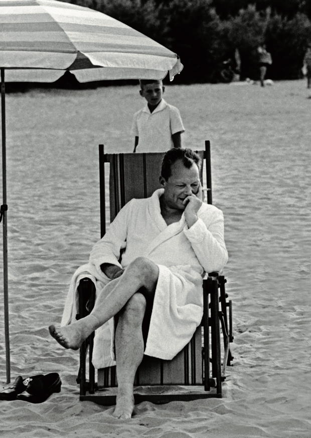 Ein Mann sitzt entspannt in einem Bademantel auf einer Liege unter einem Sonnenschirm am Strand. Im Hintergrund sind weitere Menschen zu sehen, die die Sonne genießen.