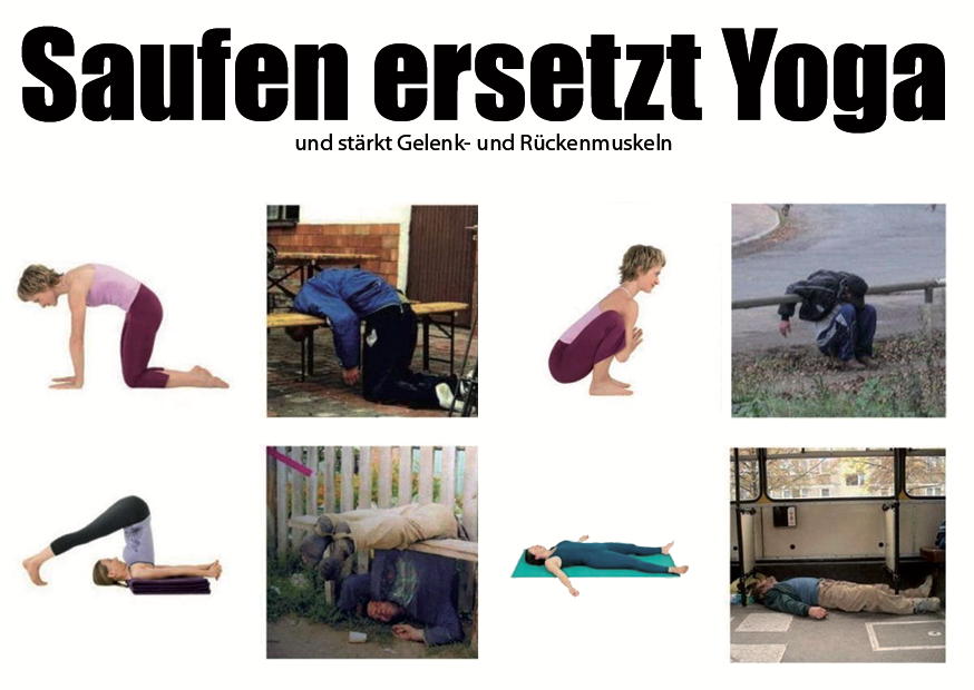 Die Darstellung humorvoller Alternativen zu Yoga zeigt verschiedene Personen in ungewöhnlichen Positionen in einer städtischen Umgebung.