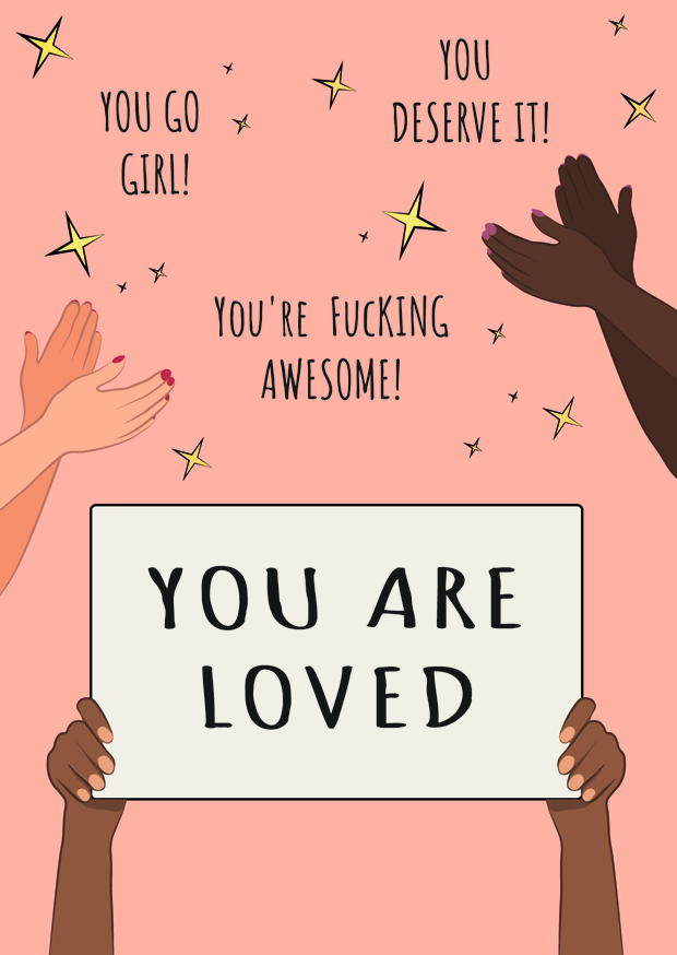 Hände in verschiedenen Hauttönen applaudieren und halten ein Schild mit der Botschaft „You are loved“. Die Gestaltung strahlt Freude und Bestärkung aus.