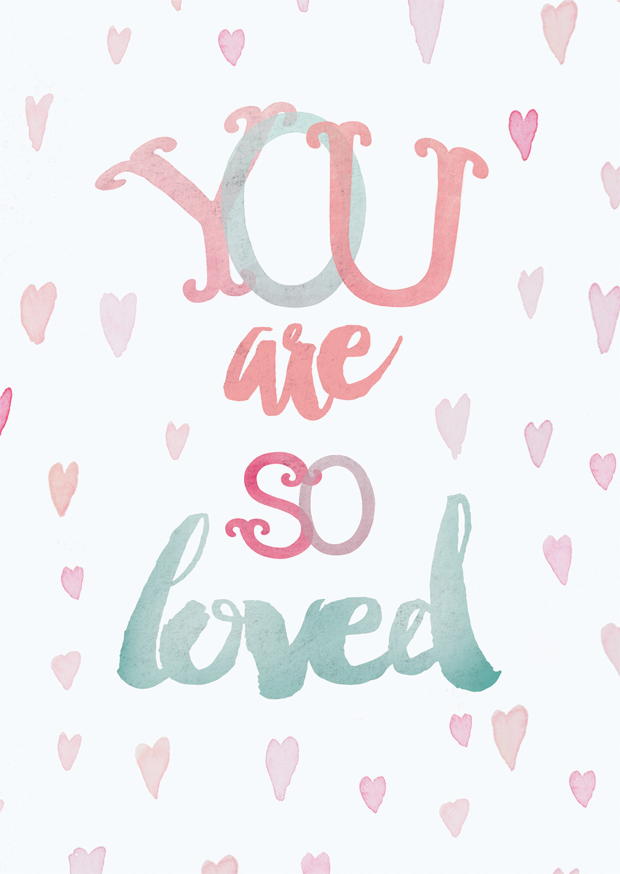 Diese bunte Illustration zeigt die Worte Du bist so geliebt in geschwungener Schrift, umgeben von zarten Herzen in sanften Rosa- und Blautönen, ideal für inspirierende Dekoration.