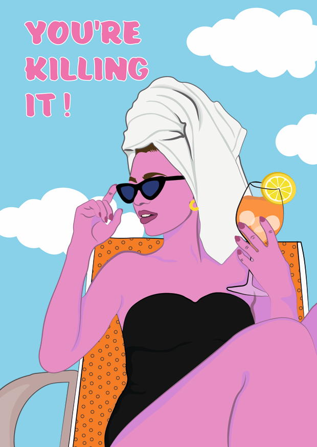 Diese Szene zeigt eine entspannte Frau, die in einem Lounge-Stuhl sitzt. Sie trägt Sonnenbrillen, hält einen Cocktail und wirkt selbstbewusst und zufrieden unter strahlend blauem Himmel.