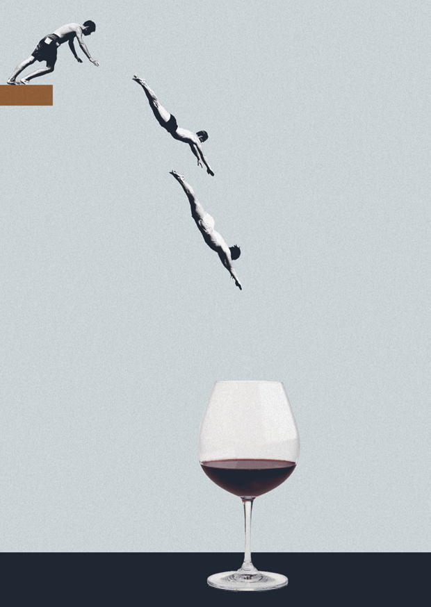 Drei männliche Taucher springen nacheinander in ein großes Weinglas. Der Hintergrund ist schlicht gehalten, was den Fokus auf die Aktion lenkt.