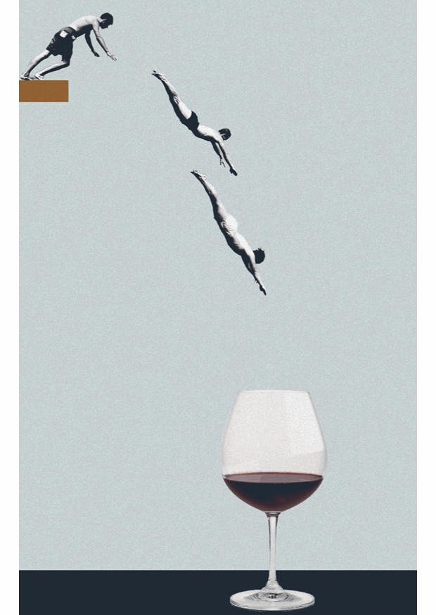 Drei Personen springen synchron von einem Sprungbrett in ein großes Weinglas. Der Himmel ist grau und schafft eine ruhige Atmosphäre.