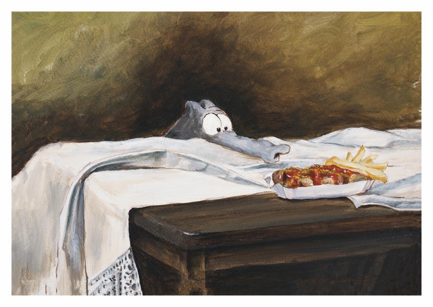 Ein neugieriger Charakter beobachtet hungrig ein leckeres Gericht mit Würstchen und Pommes, das liebevoll auf einem Tisch angerichtet ist.