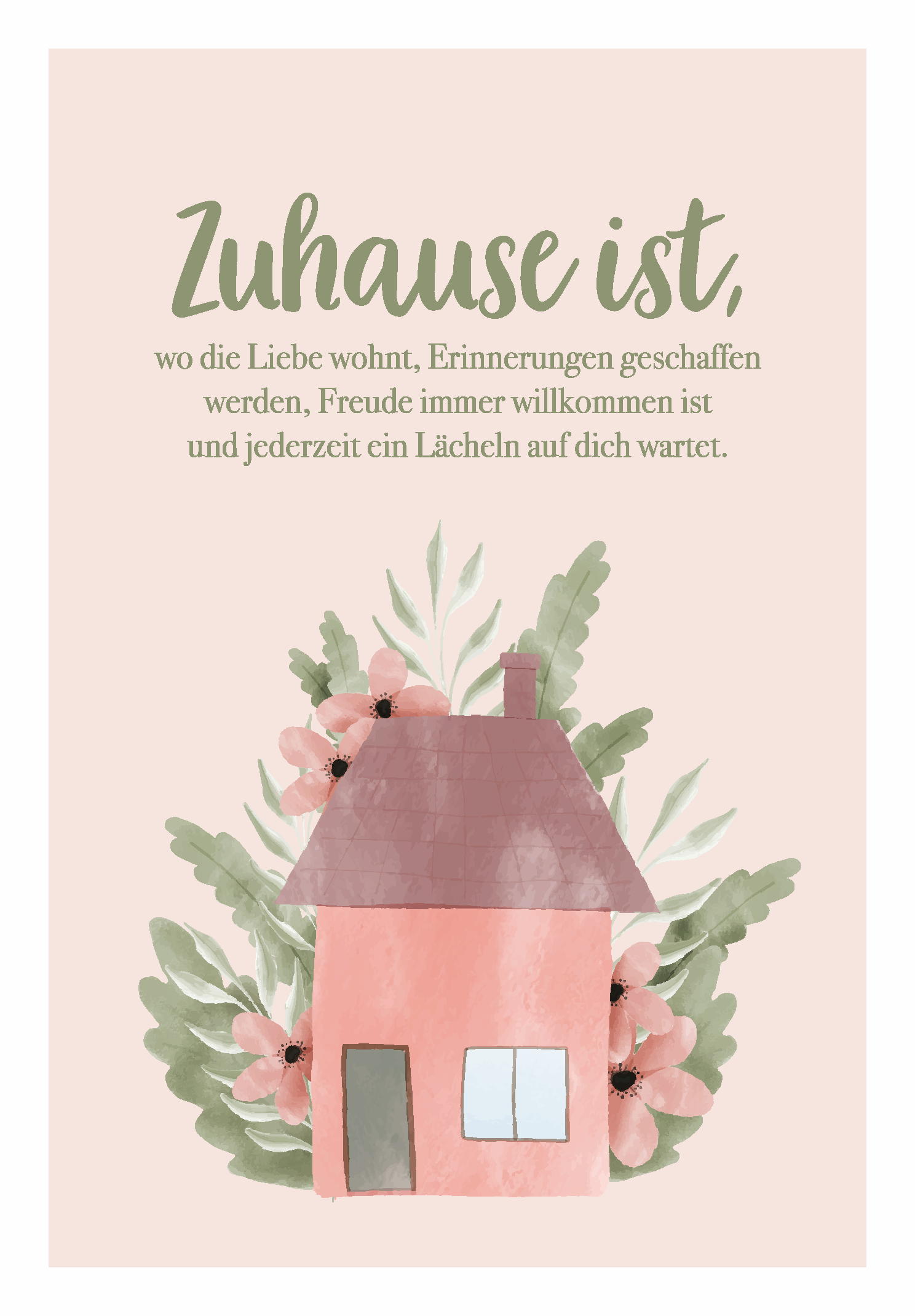 Ein handgezeichnetes Motiv zeigt ein rosa Häuschen, umrahmt von grünen Blättern und Blumen. Der Spruch beschreibt die Bedeutung von Zuhause und lädt zur Freude ein.