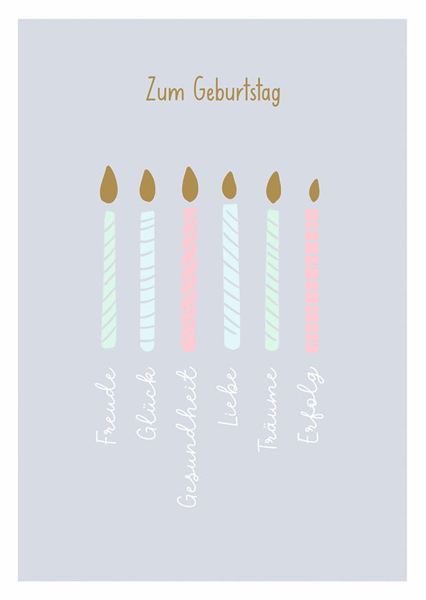 Eine festliche Geburtstagskarte zeigt sechs Kerzen in unterschiedlichen Farben. Jede Kerze repräsentiert Glück und besondere Wünsche für das neue Lebensjahr.