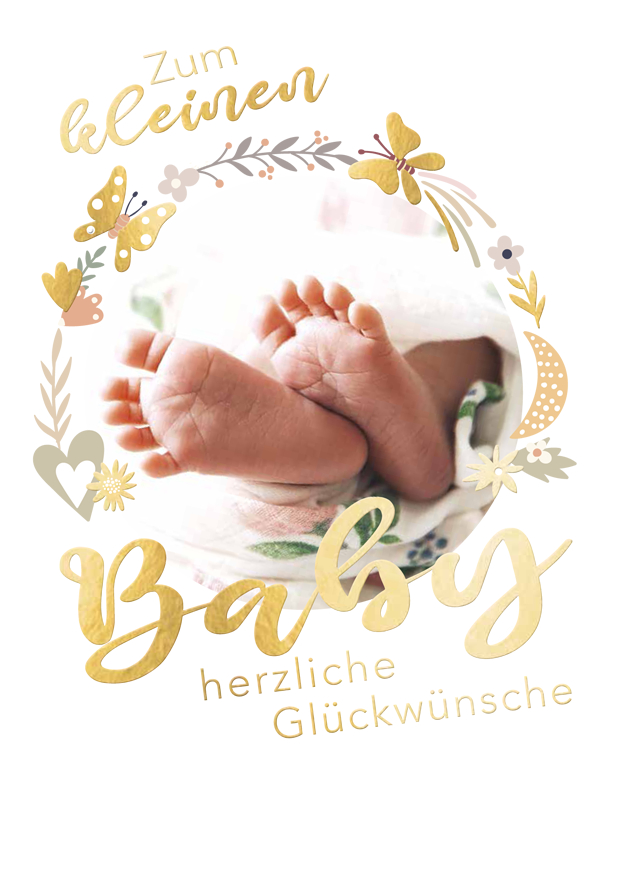 Die bezaubernden Füße eines Neugeborenen sind liebevoll umrahmt von floralen Motiven und Schmetterlingen. Herzliche Glückwünsche werden ausgedrückt.