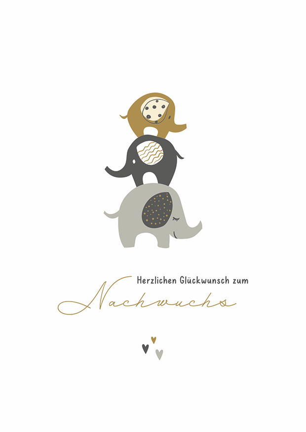 Diese kreative Geburtstagskarte zeigt drei stilisierte Elefanten in sanften Farben, die fröhlich aufeinander stehen und herzliche Glückwünsche zum Nachwuchs präsentieren.
