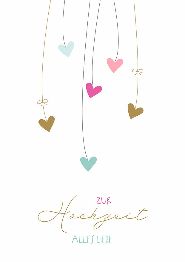 Eine stilvolle Einladung zur Hochzeit mit herzlichen Motiven in sanften Farben. Bunte Herzen hängen an feinen Fäden und vermitteln eine romantische Atmosphäre.