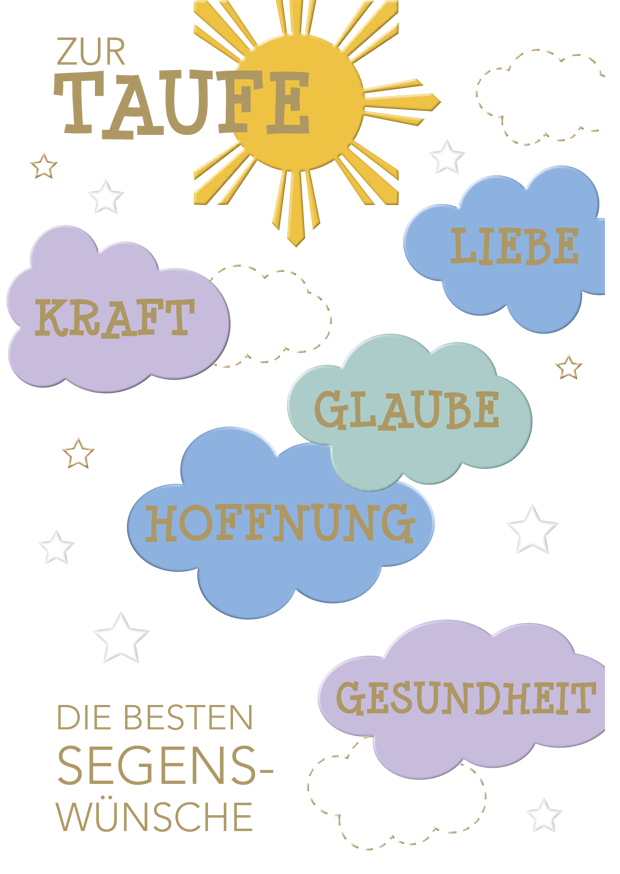 Bunte Wolken in Pastelltönen umgeben eine Sonne und vermitteln Segenswünsche zur Taufe, darunter Kraft, Liebe, Glauben, Hoffnung und Gesundheit.