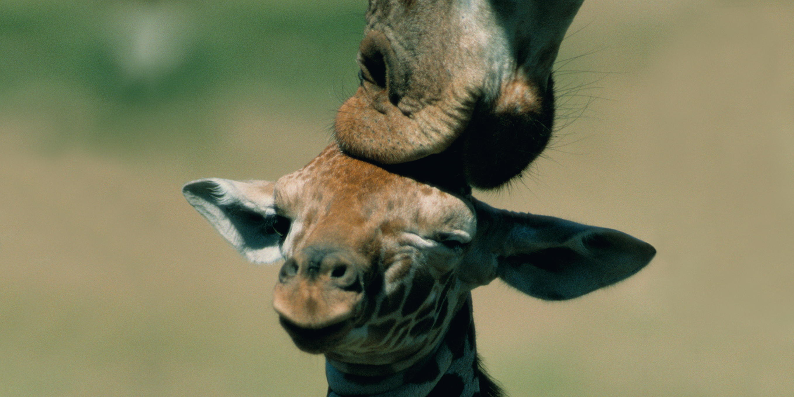 Eine Muttergiraffe beugt sich zu ihrem Jungtier und drückt sanft ihren Kopf an dessen. Das Szenario spielt sich in einer weiten, sonnigen Savanne ab.