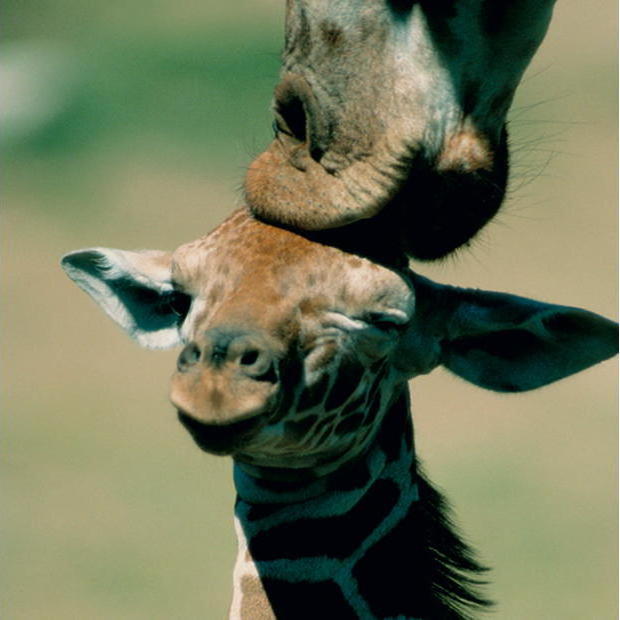 Eine erwachsene Giraffe zeigt Zuneigung zu ihrem Jungtier, das glücklich wirkt, während sie in der afrikanischen Savanne stehen. Die Szene strahlt Wärme und Liebe aus.