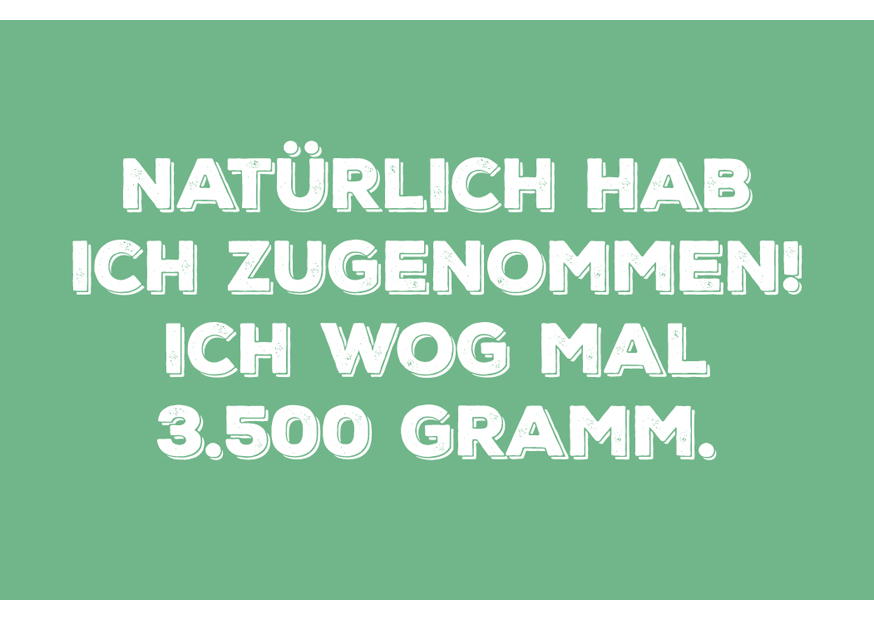 Der Text drückt auf witzige Weise aus, dass man zugenommen hat und sich darüber nicht beschwert. Es wird die frühere Gewichtszahl von 3.500 Gramm erwähnt.