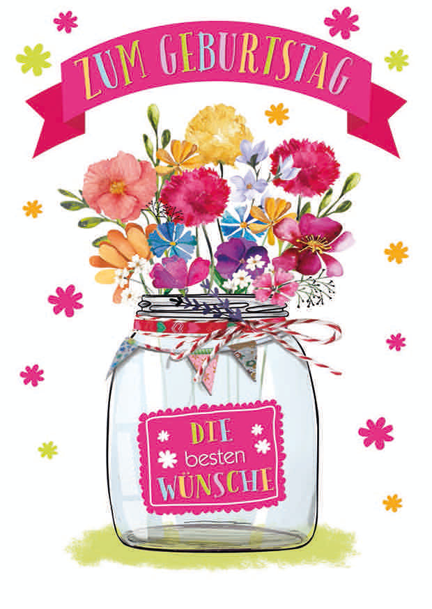 Eine kreative Geburtstagskarte zeigt ein Glas voller bunter Blumen. Darunter stehen die besten Wünsche, um Freude und Glück zu vermitteln.