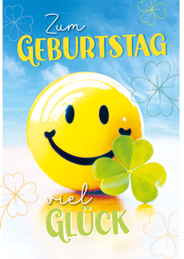 Ein strahlender gelber Smiley mit einem breiten Lächeln hält einen Glücksklee. Der Hintergrund ist hellblau, ideal für Geburtstagsgrüße voller Glück.