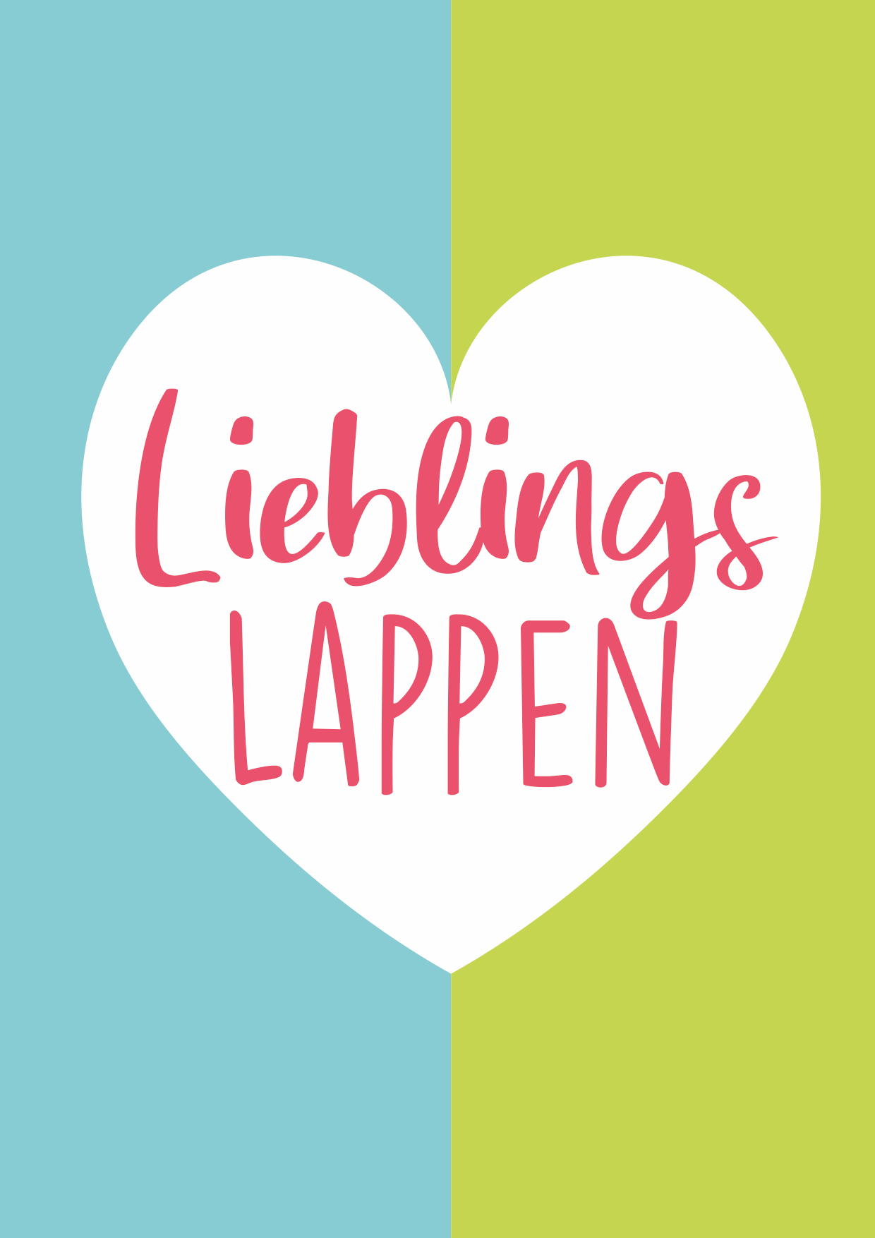 Der Schriftzug Lieblingslappen steht prominent in einem Herz, umgeben von hellblauen und hellgrünen Farben, was eine fröhliche Stimmung vermittelt.