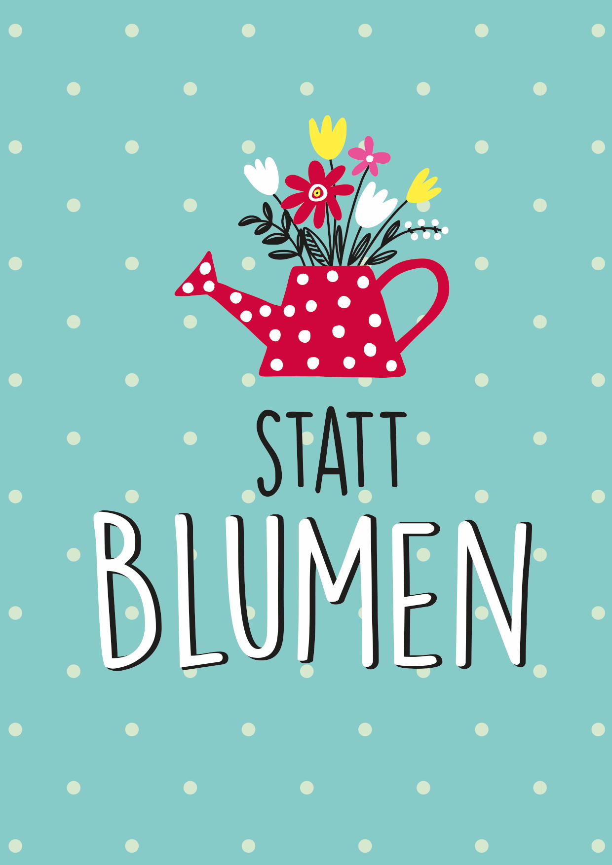 Eine rote Gießkanne mit bunten Blumen steht vor einem hellblauen Hintergrund und vermittelt eine fröhliche und einladende Stimmung. Der Schriftzug fordert dazu auf, statt Blumen zu schenken.