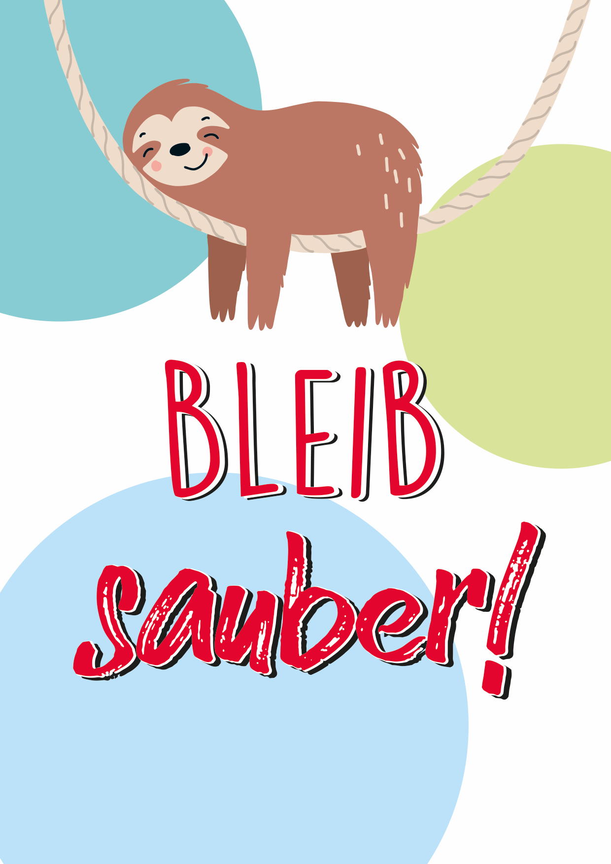 Diese Grafik zeigt ein freundliches Faultier an einem Seil, kombiniert mit Farben und dem Aufruf Bleib sauber, was für Umweltschutz steht.